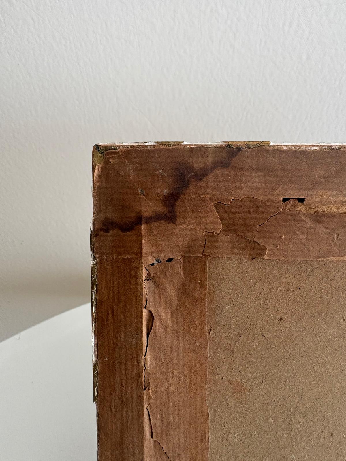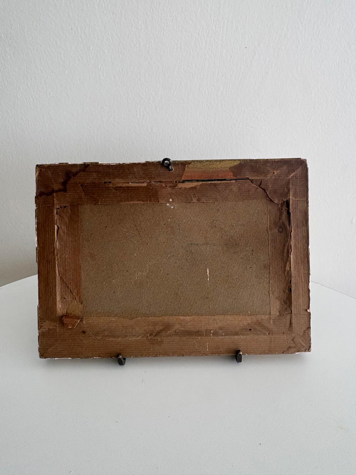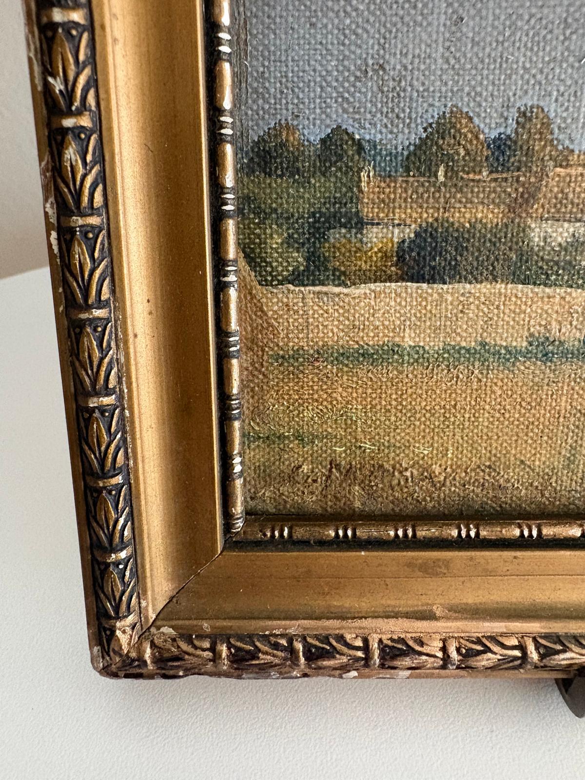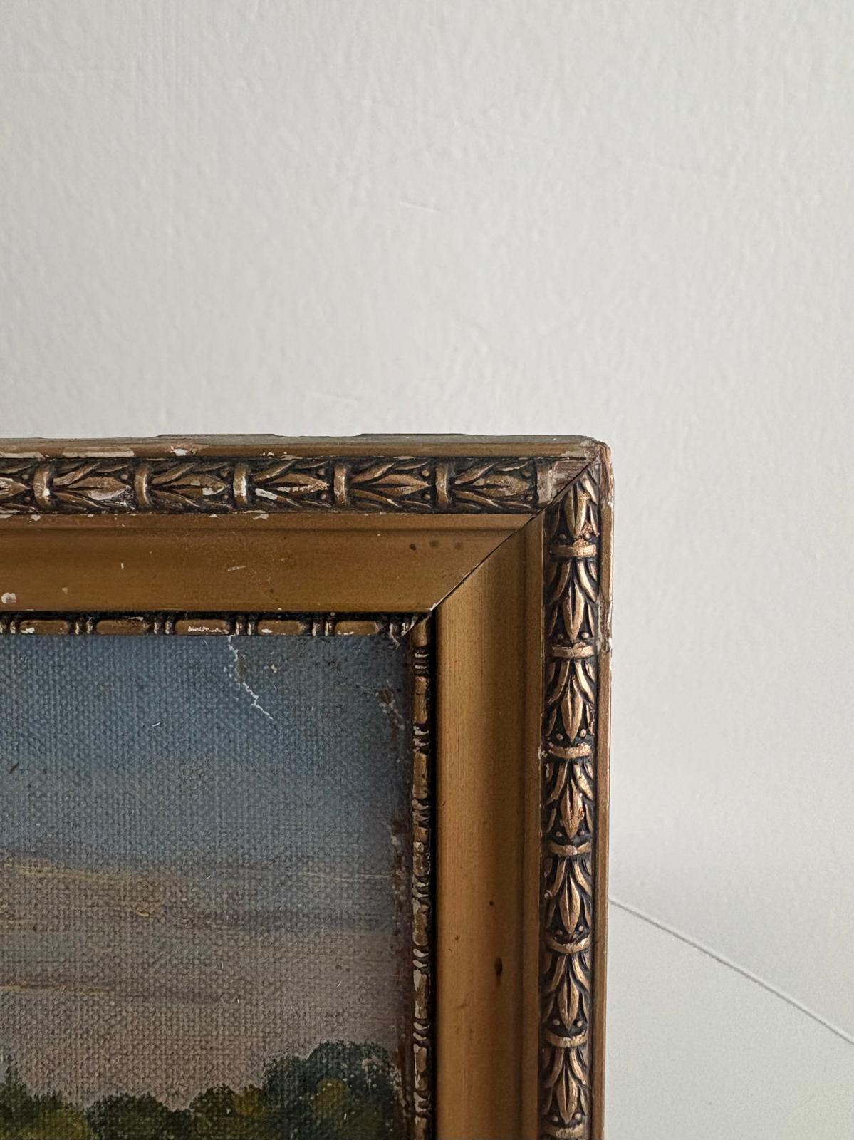A charming antique French landscape painting on board depicting a quiet pastoral scene with fields, trees, and distant buildings under a soft sky. Set in an ornate gilt frame with carved detailing, this piece has a timeless, collected feel and works beautifully layered on a shelf or hung as part of a gallery wall. The back retains its original paper backing, showing age and authenticity. Frame has surface wear and minor losses. There is visible loss and damage to the painted surface. It measures 9⅛" W x 6½"H x ⅝"D