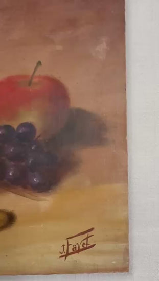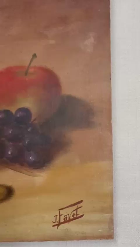 This charming still life oil painting depicts a classic arrangement of fruit including peaches, grapes, and an apple, rendered in warm, earthy tones. Painted on a solid wood panel, the composition reflects a traditional still-life style with soft brushwork, balanced lighting, and a timeless, rustic elegance. The work is signed J. Favet in the lower right and shows natural, honest wear consistent with age, including light surface marks and edge wear to the panel, adding to its authentic character. Unframed, it displays beautifully on a shelf, easel, or can be framed to suit a more formal setting. 15¼"W x 11¾"H $165