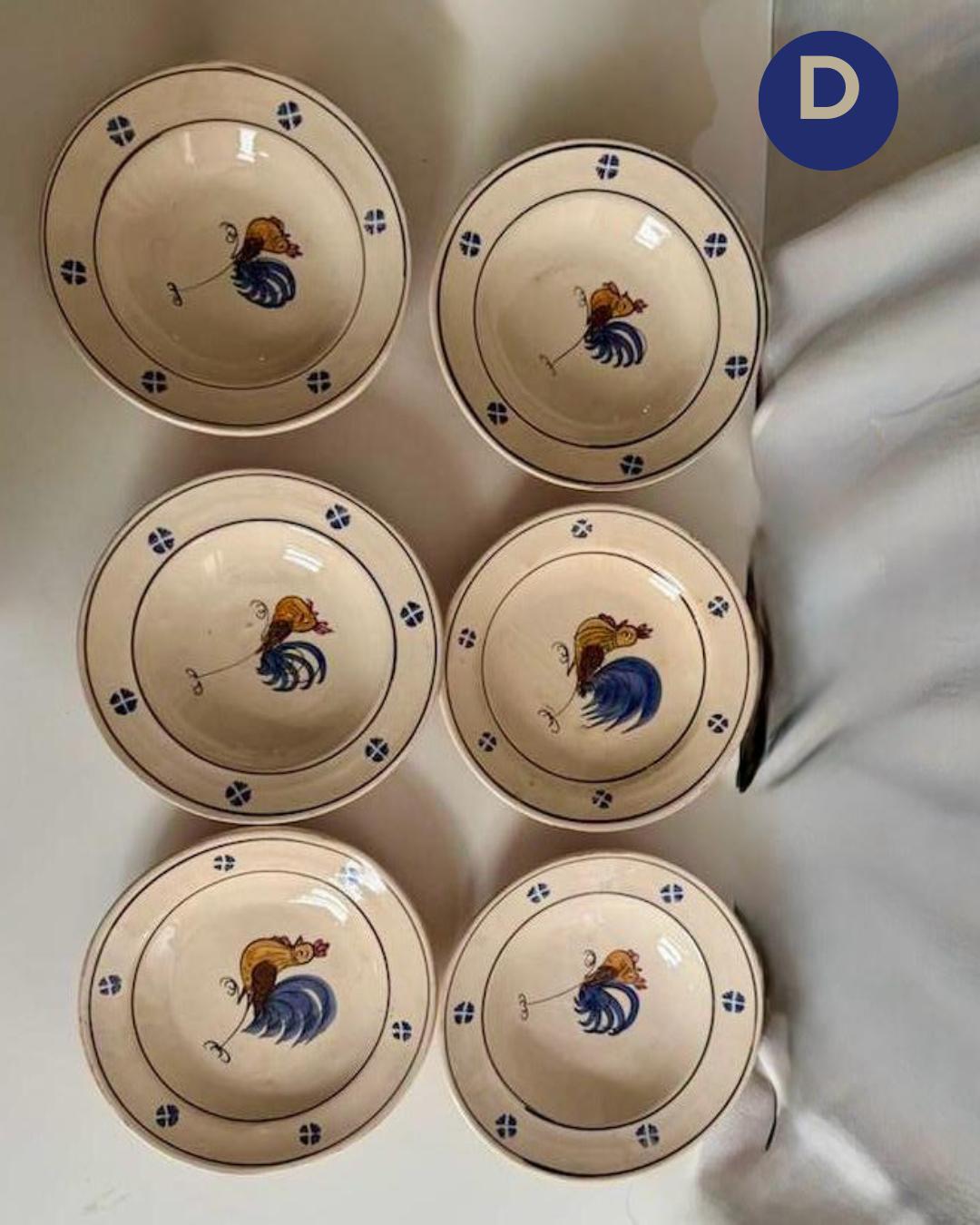 This charming vintage Italian dishware from the Puglia region, (likely Grottaglie or Laterza) hand-painted with a lively rooster in vivid blue, green, and ochre tones. It dates to from 1950s–1960s. Decorated by small cobalt blue flower clusters and roosters